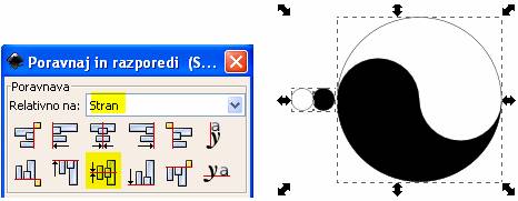- Središče kroga postavimo na sredino delovne površine. Kliknemo na ikono Poravnaj in razporedi predmete