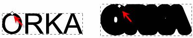 - Uredimo vrhnja oglišča posameznih črk. Pri črki K gornjima ogliščema dodamo novi vozlišči. Vozlišče v oglišču zbrišemo in oblikujemo odsek v krivuljo.